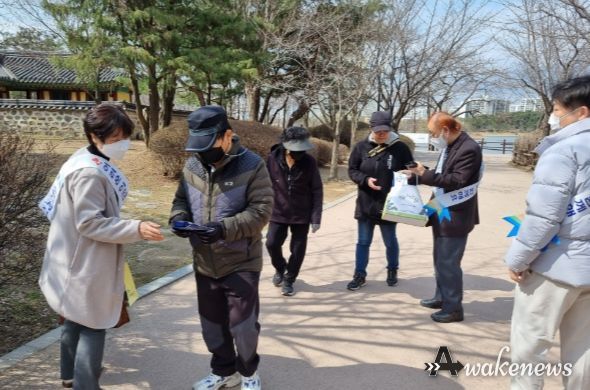 어웨이크뉴스 오경하 기자 | 수원시 장안구 송죽동 지역사회보장협의체는 지난 15일 만석공원에서 복지사각지대 위기가구 발굴을 위한 캠페인을 펼쳤다.