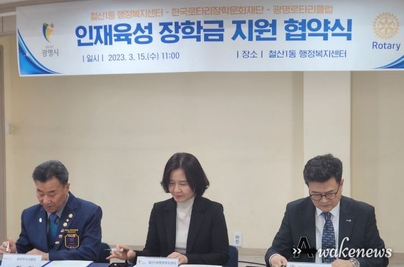 어웨이크뉴스 오경하 기자 | 광명시 철산1동 행정복지센터는 지난 15일 광명로타리클럽, 한국로타리장학문화재단과 인재육성 장학금 지원 사업을 위한 업무협약을 맺었다.