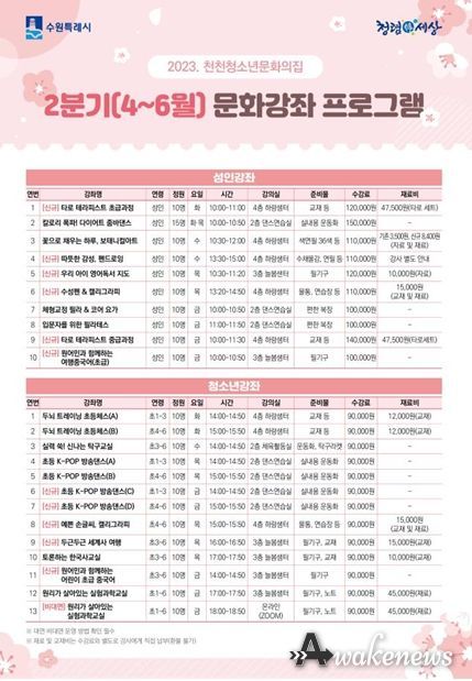 어웨이크뉴스 오경하 기자 | 수원시청소년재단 천천청소년문화의집은 3월 31일까지'2023년 2분기(4~6월) 문화강좌' 수강생을 모집한다.