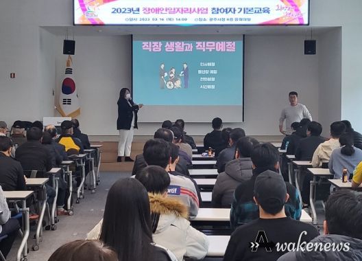 어웨이크뉴스 오경하 기자 | 광주시는 16일 시청 중회의실에서 장애인 일자리 참여자 71명을 대상으로 ‘2023년 장애인일자리사업 참여자 기본교육’을 실시했다.