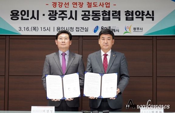 어웨이크뉴스 오경하 기자 | 광주시는 16일 용인시청에서 용인시와 경강선 연장(광주·용인) 철도사업 공동협력을 위한 업무협약을 체결했다.