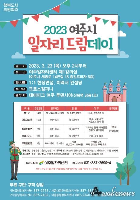 어웨이크뉴스 오경하 기자 | 여주시는 3월 23일 여주일자리센터에서 2023년 3월 일자리 드림데이를 실시한다고 밝혔다.