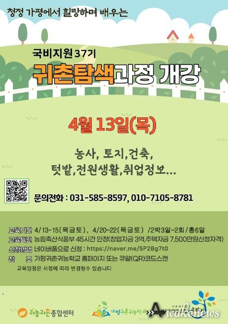 어웨이크뉴스 오경하 기자 | 가평귀촌귀농학교에서 ‘청정 가평에서 힐링하며 배우는 국비지원 37기 귀촌탐색과정’ 귀농귀촌 교육생을 모집한다.