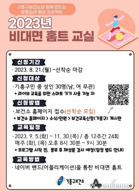어웨이크뉴스 오경하 기자 | 용인특레시 기흥구보건소가 건강한 생활 습관을 키울 수 있도록 지역 주민을 대상으로 ‘비대면 홈트레이닝 교실’을 운영, 참가자를 모집한다.