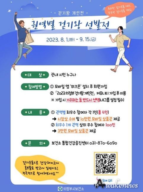 어웨이크뉴스 오경하 기자 | 의정부시 보건소는 비대면 건강생활실천사업의 일환으로 8월 1일부터 9월 15일까지 모바일 어플리케이션(워크온)을 이용한 2023 걷기왕 개인전 ‘권역별 걷기왕 선발전’을 진행 중이다.