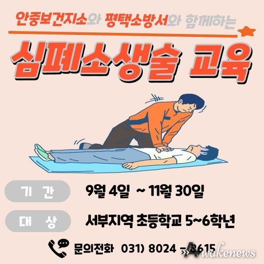 어웨이크뉴스 오경하 기자 | 평택시 안중보건지소는 평택소방서와 협력하여 어린이 재난안전교육으로 ‘찾아가는 심폐소생술 교육’을 오는 9월 4일부터 11월 30일까지 4개 초등학교에서 진행한다.