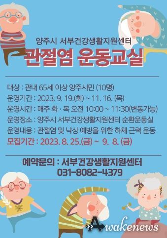 어웨이크뉴스 오경하 기자 | 양주시 보건소는 서부 건강생활지원센터에서 오는 25일부터 관절질환 고위험군을 대상으로 ‘2023년 2기 관절염 운동교실’참여자를 모집한다고 밝혔다.