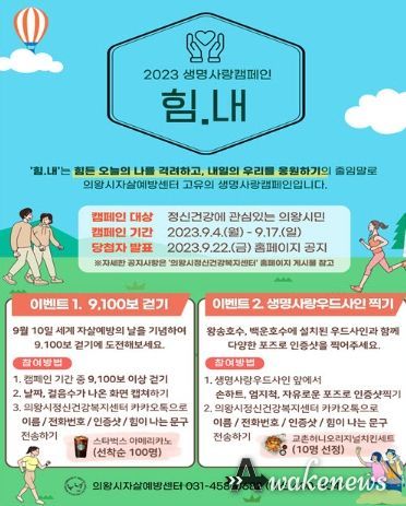 어웨이크뉴스 오경하 기자 | 의왕시정신건강복지센터(부설 의왕시자살예방센터)는 9월 10일 세계 자살 예방의 날을 기념해 2023년 생명 사랑 캠페인 ‘힘내’를 9월 4일부터 9월 17일까지 2주간 진행한다고 밝혔다.