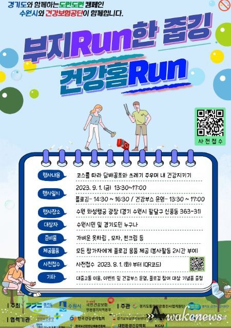 수원시보건소와 경기도, 국민건강보험공단 인천경기지역본부가 공동 주최하는 ‘부지RUN한 줍깅 건강홈RUN’은 9월 1일 오후 1시 30분부터 5시까지 열린다.