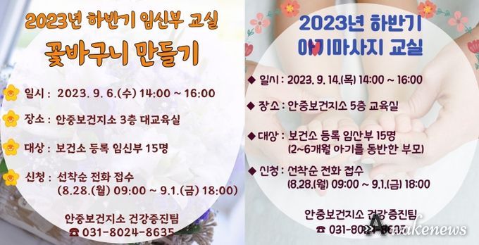 프로그램 참여를 희망하는 임산부는 8월 28일부터 9월 1일까지 5일간 안중보건지소 모자보건실로 신청하면 된다.