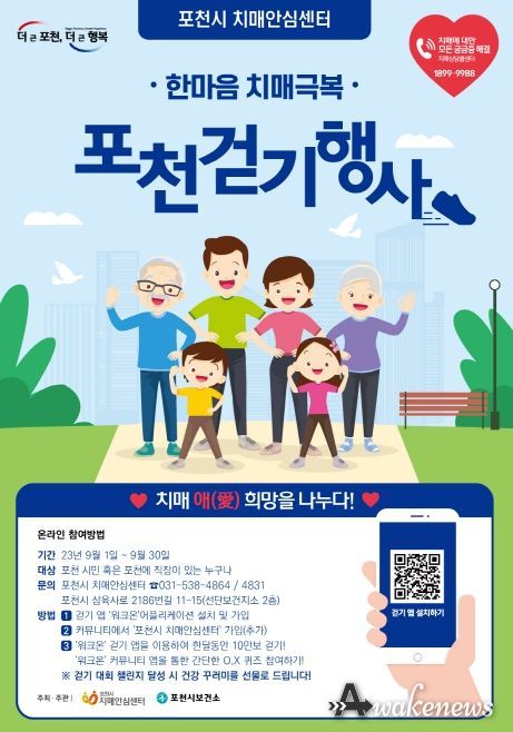 어웨이크뉴스 오경하 기자 | 포천시치매안심센터는 오는 9월 1일부터 9월 30일까지 ‘2023년도 한마음 치매 극복 걷기 대회’를 개최한다.