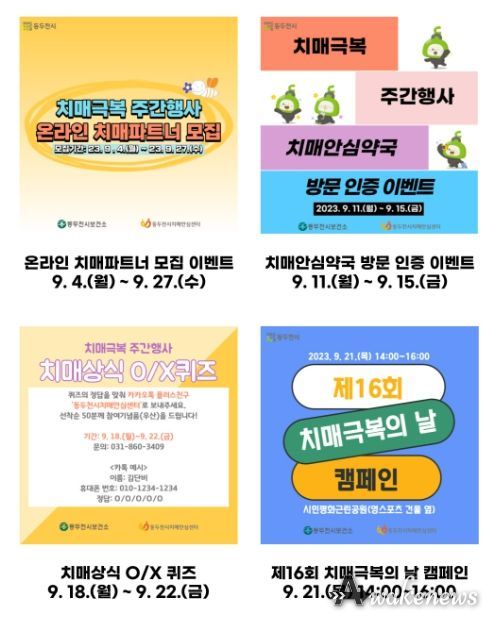 어웨이크뉴스 오경하 기자 | 동두천시치매안심센터는 제16회 치매극복의 날(9. 21.)을 맞아 치매에 대한 부정적 인식을 개선하고 치매예방 활동을 홍보하기 위해 9월 한 달 동안 다양한 행사를 운영한다. 이번 행사는 9월 4일(월) 온라인 치매파트너 양성 이벤트를 시작으로 9월 11일(월) 치매안심약국 방문 인증 이벤트, 9월 18일(월) 치매상식 OX 퀴즈 참여 이벤트, 9월 21일(목) 치매극복의 날 캠페인 등 다채롭게 진행될 예정이다.