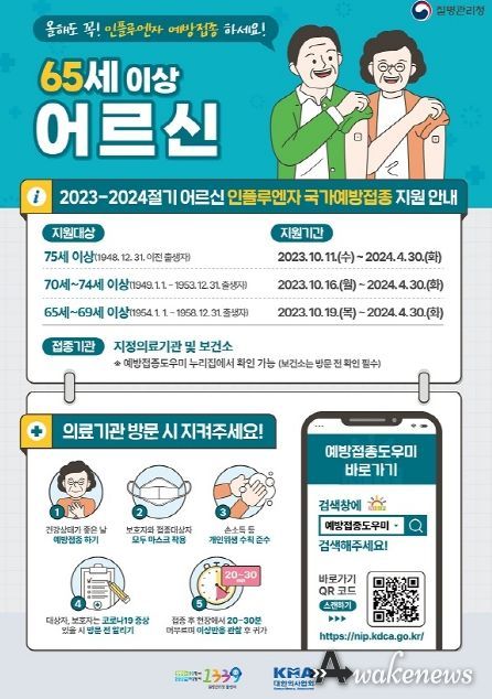 어르신의 경우 ▲75세 이상(1948.12.31. 이전 출생자)은 23년 10월 11일~24년 4월 30일 ▲70~74세(1953.12.31. 이전 출생자)는 23년 10월 16일~24년 4월 30일 ▲65~69세(1958.12.31. 이전 출생자)는 23년 10월 19일~24년 4월 30일에 접종할 수 있다.