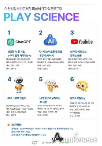 어웨이크뉴스 오경하 기자 | 이천시립서희도서관은 시민의 디지털 역량 강화와 미래 기술 이해를 돕기 위한 특성화 프로그램 ‘PLAY SCIENCE’를 운영한다. 이번 프로그램은 인공지능(AI) 기술이 일상 전반으로 확산되는 시대 흐름에 발맞춰, 인공지능(AI) 활용 교육과 과학체험 프로그램으로 구성됐다.