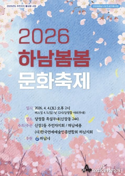 어웨이크뉴스 오경하 기자 | ‘2026 하남 봄봄 문화축제’가 오는 4월 4일 당정뜰 일원에서 열린다. 이번 축제는 신장2동 주민자치회와 (사)한국연예예술인총연합회 하남지회가 공동 주최·주관하고 하남시가 후원한다.