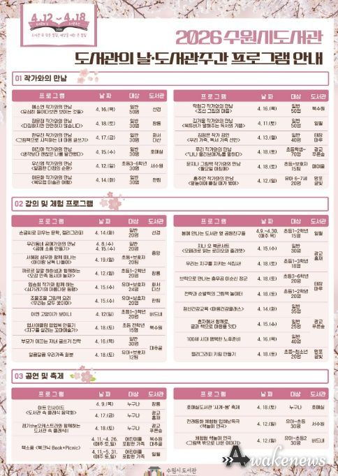 어웨이크뉴스 오경하 기자 | 수원시도서관이 제62회 도서관주간(4월 12~18일)을 맞아 ‘도서관 속 작은 펼침, 세상을 여는 큰 열림’을 주제로 다양한 독서문화 프로그램을 운영한다.