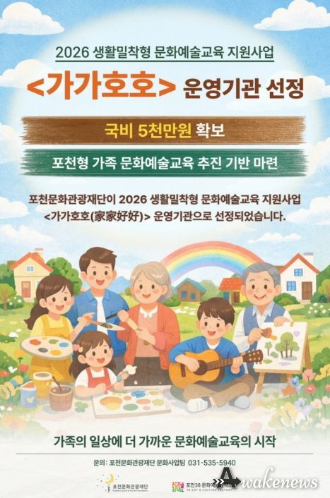 어웨이크뉴스 오경하 기자 | 포천문화관광재단이 2026 생활밀착형 문화예술교육 지원사업 ‘가가호호(家家好好)’ 운영기관 공모에 최종 선정됐다.