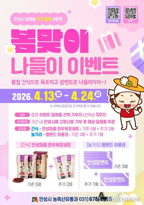 어웨이크뉴스 오경하 기자 | 안성시는 봄철 나들이 수요가 늘어나는 시기를 맞아 고향사랑기부 참여를 독려하기 위해, 오는 4월 13일부터 24일까지 ‘봄맞이 나들이 이벤트’를 진행한다고 밝혔다.