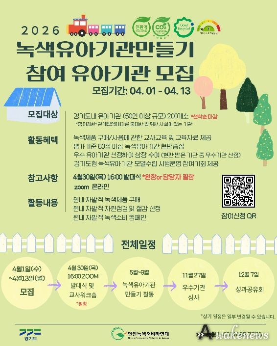 어웨이크뉴스 오경하 기자 | 경기도가 아이들이 생활 속에서 올바른 녹색 소비 습관을 가질 수 있도록 돕는 ‘2026년 녹색유아기관만들기’ 참여 기관 200곳을 4월 13일까지 모집한다.
