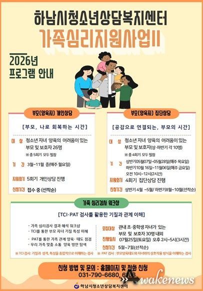 어웨이크뉴스 오경하 기자 | 하남시는 민선 8기 공약사항인 ‘심리상담 프로그램 강화’의 일환으로 청소년 가정의 정서적 안정과 건강한 가족관계 형성을 지원하기 위해 ‘우리가족심리지원사업 시즌Ⅱ’를 확대 운영하고 있다고 밝혔다.