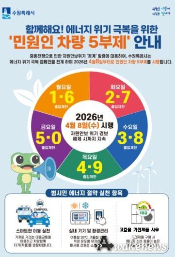 수원시 관계자는 “국가적 자원안보 위기 속에서 에너지를 절약하고, 교통 수요를 관리하기 위해 공영주차장 5부제를 추진한다”며 “시민 여러분께서 적극적으로 동참해 주시길 바란다”고 당부했다.