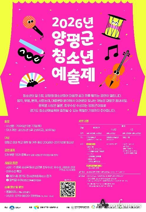 어웨이크뉴스 오경하 기자 | 양평군이 주최하고 양평서부청소년문화의집이 주관하는 ‘2026년 양평군 청소년예술제’가 오는 5월 개최되며, 4월 7일부터 25일까지 예술제 참가자를 모집한다.