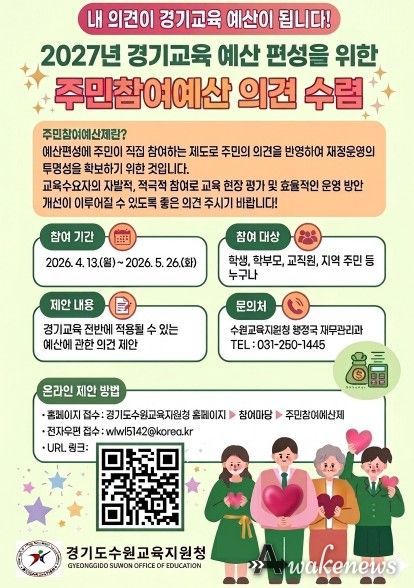 어웨이크뉴스 오경하 기자 | 경기도수원교육지원청은 4월 13일부터 5월 26일까지 2027년도 경기교육 예산 편성을 위한 주민참여예산 의견수렴을 실시한다.