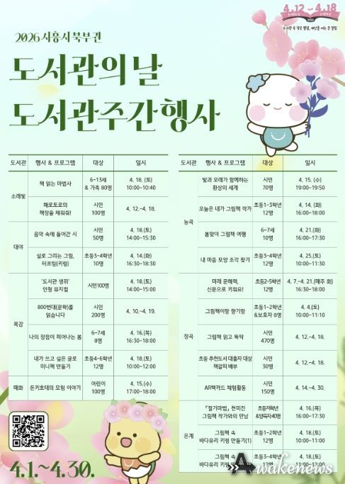 어웨이크뉴스 오경하 기자 | 시흥시 북부권 공공도서관은 4월 12일 ‘도서관의 날’과 4월 12일부터 18일까지 이어지는 ‘도서관주간’을 기념해 다양한 독서문화 행사와 현장 참여 이벤트를 4월 한 달간 운영한다.