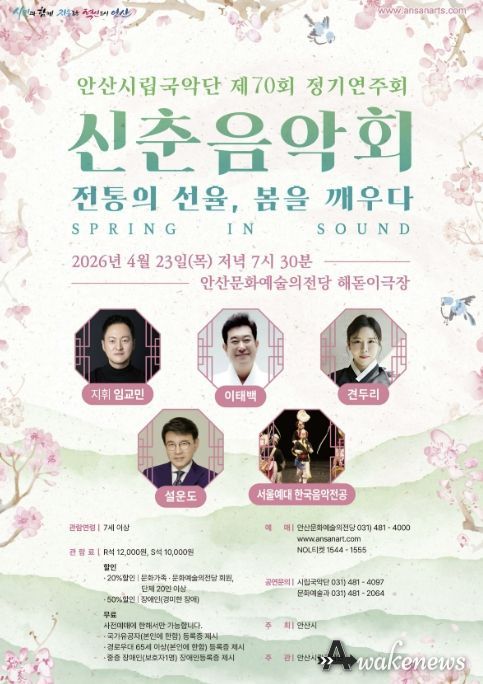 어웨이크뉴스 오경하 기자 | 안산시는 오는 23일 오후 7시 30분 안산문화예술의전당 해돋이극장에서 안산시립국악단 제70회 정기연주회 '신춘음악회 SPRING IN SOUND'를 개최한다고 13일 밝혔다.
