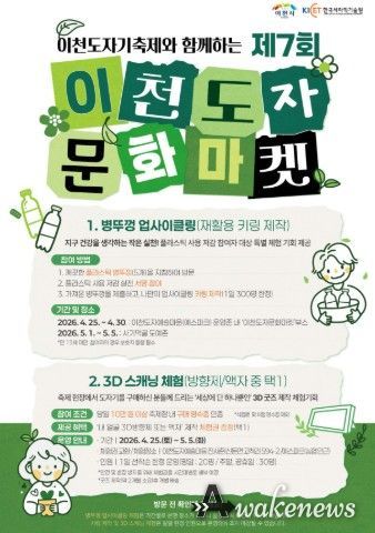 어웨이크뉴스 오경하 기자 | 이천시는 오는 4월 25일부터 5월 5일까지 11일간 이천도자예술마을과 사기막골도예촌 일원에서 ‘제7회 이천도자문화마켓’을 운영한다고 밝혔다. 이번 행사는 이천도자기축제와 연계해 추진되며, 도자기 판매와 함께 방문객이 직접 참여할 수 있는 체험프로그램 중심으로 구성됐다.