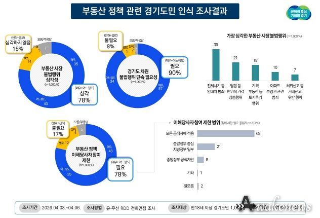 경기도가 4월 3일부터 6일까지 도민 1,000명을 대상으로 실시한 ‘부동산 정책 관련 인식조사’ 결과에 따르면 부동산 시장 내 불법행위가 ‘심각하다’는 인식은 78%로 집계됐다. 가장 큰 문제로는 ‘전세사기 등 임대차 관련 범죄(36%)’가 꼽혔다.