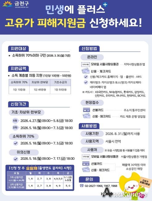 어웨이크뉴스 오경하 기자 | 금천구는 중동 정세 불안 등으로 촉발된 고유가·고환율·고물가 상황에서 구민의 생활 부담을 완화하고 지역경제를 활성화하기 위해 오는 27일부터 ‘1차 고유가 피해지원금’ 신청 접수 및 지급을 시작한다고 밝혔다.
