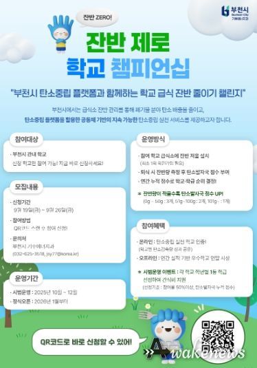 어웨이크뉴스 오경하 기자 | 부천시는 9월 19일부터 26일까지 ‘잔반제로 학교 챔피언십’ 참가학교 신청을 받는다. 관내 모든 학교가 신청할 수 있으며, 이번 사업은 학교 급식소의 음식물 잔반을 줄이고 폐기물 분야 온실가스 배출을 낮춰 탄소중립을 실현하기 위해 마련됐다.