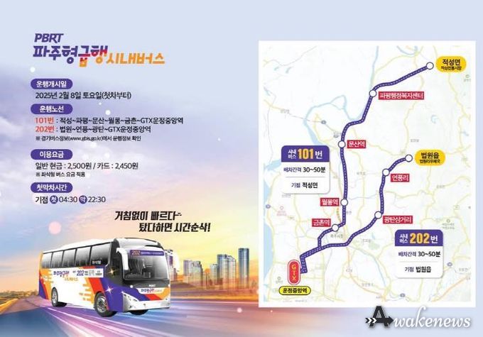 파주시가 내놓은 해법은 신도시와 구도심의 주요 거점을 연결하는 파주형 간선급행시내버스(PBRT, Paju Bus Rapid Transit)다. 올해 2월 개통한 파주형 간선급행시내버스는 적성‧문산 권역과 법원‧광탄 권역에서 신도시 내 지티엑스(GTX) 운정중앙역을 연계하는 두 개 노선으로, 3~5개 정류장만 경유해 이동시간을 30분 이내로 단축했다. 이 중 적성‧문산권 노선은 경의중앙선 3개 역(문산, 월롱, 금촌)에도 정차해 지티엑스(GTX) 뿐만 아니라 경의중앙선과의 접근성도 향상시켰다.