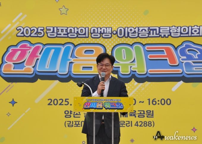 어웨이크뉴스 오경하 기자 | 김병수 시장은 9월 19일 골드밸리 중앙체육공원에서 열린 ‘2025 김포상공회의소 상생·이업종교류협의회 한마음 워크숍’에 참석해 지역 기업인들을 격려하고 축하했다. 이날 행사는 비가 내리는 궂은 날씨 속에서도 200여 명의 기업인과 관계자가 참여해 열띤 분위기 속에 행사가 진행됐다.