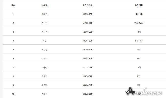 2위 김상현과 10위 김태우(27.(주)하이니스임플란트)의 포인트 격차는 22,659.96포인트다. 또한 10위 김태우와 13위 이승형(22), 17위 김범수(27)와 포인트 차는 각각 10,221.45포인트, 12,766.24포인트다. 10위 김태우와 20위 하충훈(35.㈜일신테크놀로지)와 차이는 16,500.06포인트다.