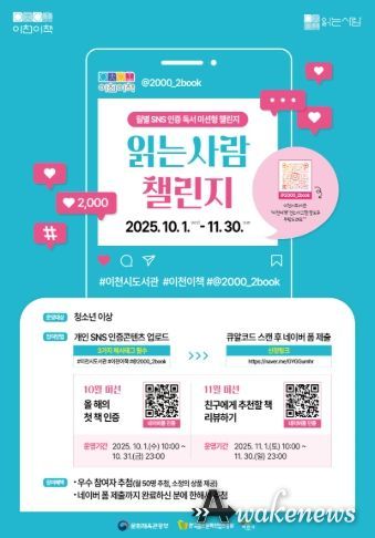 어웨이크뉴스 오경하 기자 | 이천시는 2025 독서기반 지역 활성화 공모 사업의 일환으로 이천이책 사회관계망(SNS) 인증 독서 미션형 챌린지인 ‘읽는 사람 챌린지’를 오는 10월 1일부터 11월 30일까지 두 달간 운영한다.