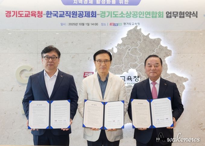 어웨이크뉴스 오경하 기자 | 경기도교육청이 1일 남부청사에서 경기도소상공인연합회, 한국교직원공제회와 ‘지역경제 활성화를 위한 상생 업무협약’을 체결했다.