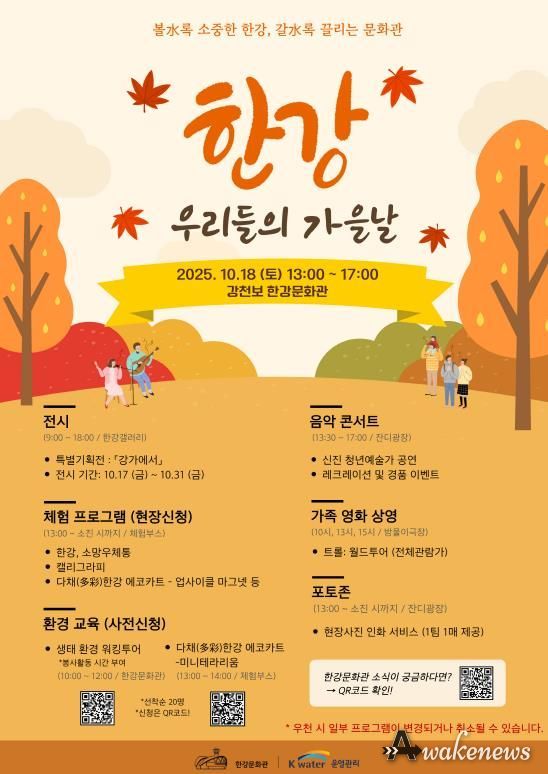 어웨이크뉴스 오경하 기자 | K-water한강보관리단과 케이워터운영관리 한강문화관은 오는 10월 18일 가족과 이웃이 함께 즐기는 대표 문화축제 “한강, 우리들의 가을날”를 개최한다고 밝혔다
