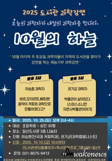 어웨이크뉴스 오경하 기자 | 고양특례시 일산도서관에서는 과학자들의 재능기부 도서관 과학 강연프로그램 ‘10월의 하늘’을 운영한다.