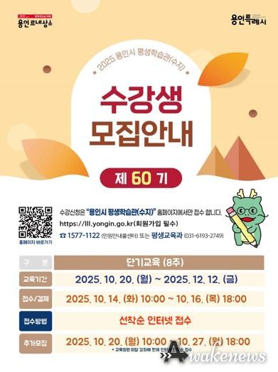 어웨이크뉴스 오경하 기자 | 용인특례시는 14일부터 16일까지 수지에 위치한 용인시 평생학습관에서 진행되는 ‘제60기 단기(8주) 교육 프로그램’ 수강생을 모집한다고 9일 밝혔다.