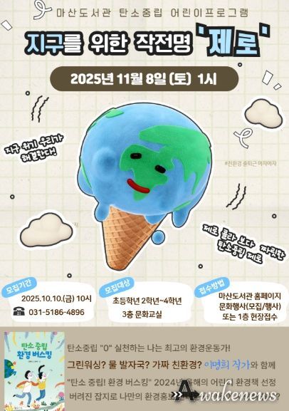 어웨이크뉴스 오경하 기자 | 김포시 마산도서관에서 오는 11월 8일 오후 1시부터 3시까지, 초등학교 2학년~4학년 어린이를 대상으로 탄소중립 어린이 프로그램 책풍당당 '지구를 위한 작전명 ‘제로’'를 운영한다.