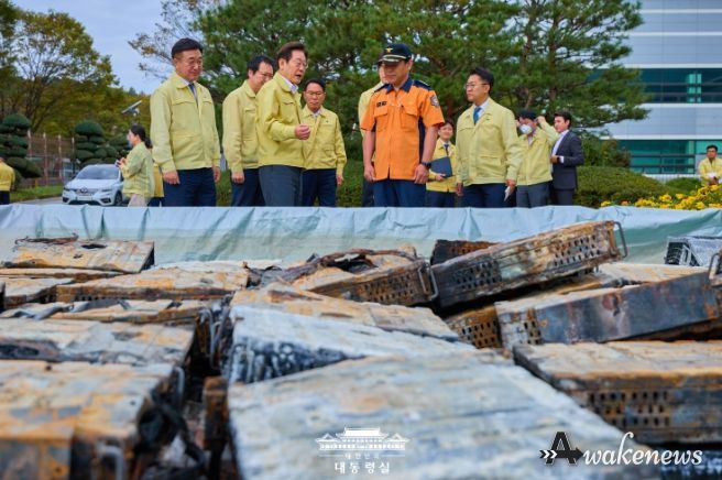 이 대통령은 먼저 화재구역 배터리를 모아 둔 냉각 침수조를 둘러본 뒤, 실제 화재가 발생한 5층 전산실을 찾아 피해 상황을 점검했다.