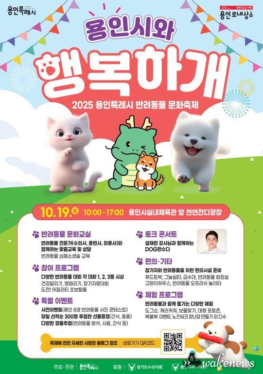 어웨이크뉴스 오경하 기자 | 용인특례시는 지역 내 반려인들을 위한 문화축제 ‘2025 용인시와 행복하개’를 19일 용인시실내체육관 앞 천연잔디광장에서 개최한다고 13일 밝혔다.