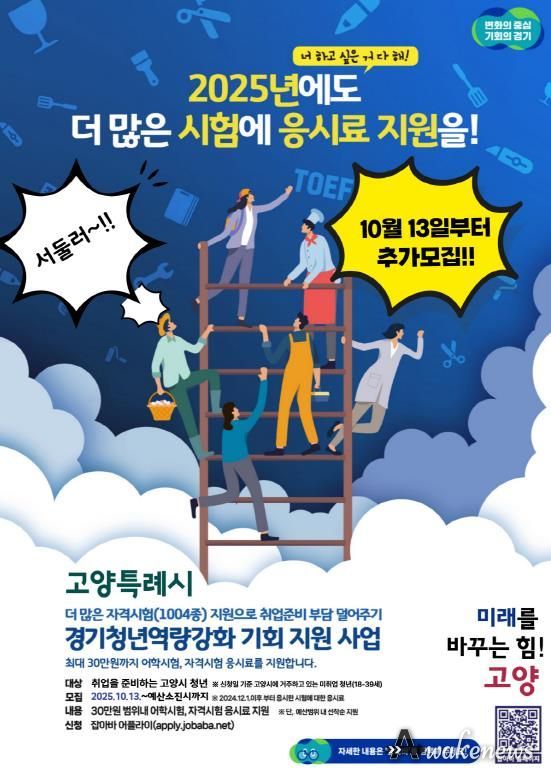 어웨이크뉴스 오경하 기자 | 고양특례시는 오는 13일 오전 9시부터 12월 4일까지 예산 소진으로 마감됐던 ‘경기청년 역량강화 기회지원사업’ 신청자를 추가 모집한다고 밝혔다.