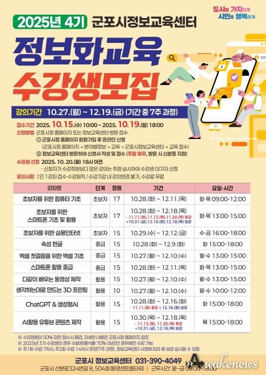 수강신청은 2025년 10월 15일 오전 10시부터 10월 19일 오후 6시까지 가능하며, 군포시청 홈페이지 또는 군포시 정보교육센터(산본로324번길 8, 504호, 주말 휴무) 방문을 통해 신청할 수 있다.
