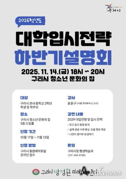 어웨이크뉴스 오경하 기자 | 구리시는 ‘2026학년도 대학입시 전략 하반기 설명회’ 참석자를 오는 10월 17일부터 구리시 통합예약 포털을 통해 선착순 110명까지 신청받는다고 밝혔다.