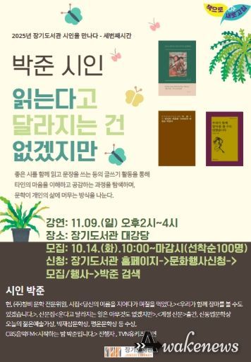 어웨이크뉴스 오경하 기자 | 김포시 장기도서관은 2025년 공공도서관 독서프로그램 운영 지원사업으로 '시인을 만나다-박준 시인'을 오는 11월 9일, 오후 2시부터 4시까지 장기도서관 대강당에서 운영한다고 밝혔다