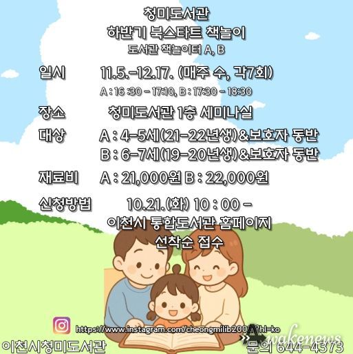 어웨이크뉴스 오경하 기자 | 이천시 청미도서관은 오는 11월 5일부터 12월 17일까지, 유아와 보호자를 대상으로 ‘하반기 북스타트 책놀이’ 프로그램을 운영한다.