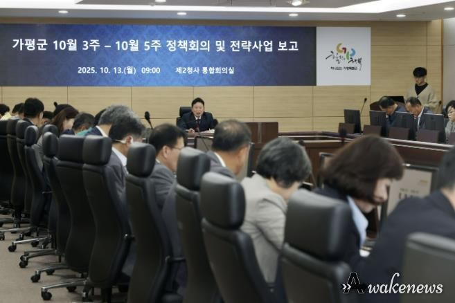 어웨이크뉴스 오경하 기자 | 가평군은 13일 2청사 통합회의실에서 ‘2025년 50대 전략사업 3분기 보고회’를 열고 주요 현안사업 추진상황을 점검하며 군정 운영 방향을 공유했다.
